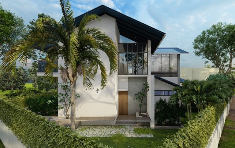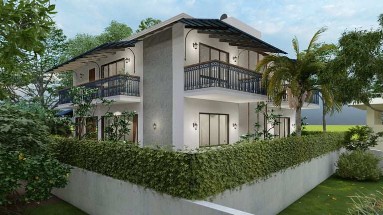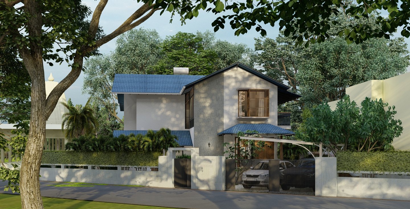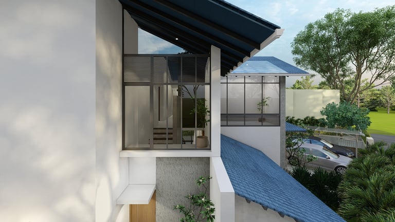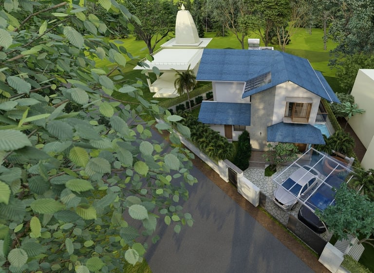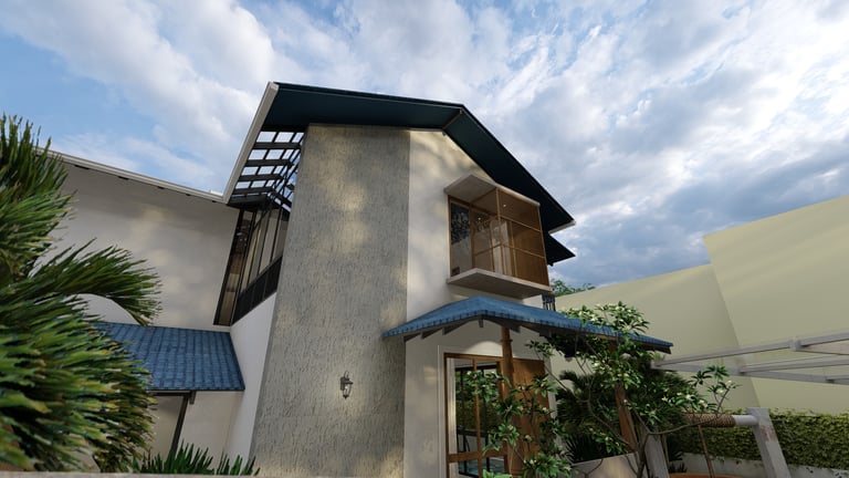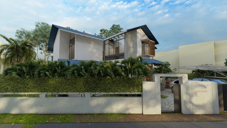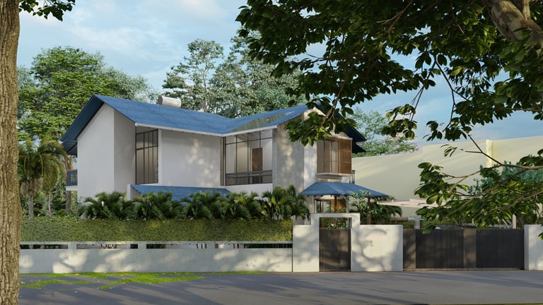 The project "Vrindavan" is one of the most exciting and heartfelt endeavors we've undertaken. It's not just about the design; it's about Sandesh Nayak and Kusum Mallya, our cherished clients. As architects, we encountered numerous challenges on site, especially with the triangular plot and significant area allocated for road widening. We meticulously designed the house within the net area, adhering to by-laws and Vastu principles. Embracing the site context, we chose Mangalore tiled roofing in a blue shade, reflecting the clients' love for the color. Every space is thoughtfully crafted to align with their hobbies and activities, ensuring their retirement life is enriched with joy and comfort in their perfect home, "Vrindavan."
