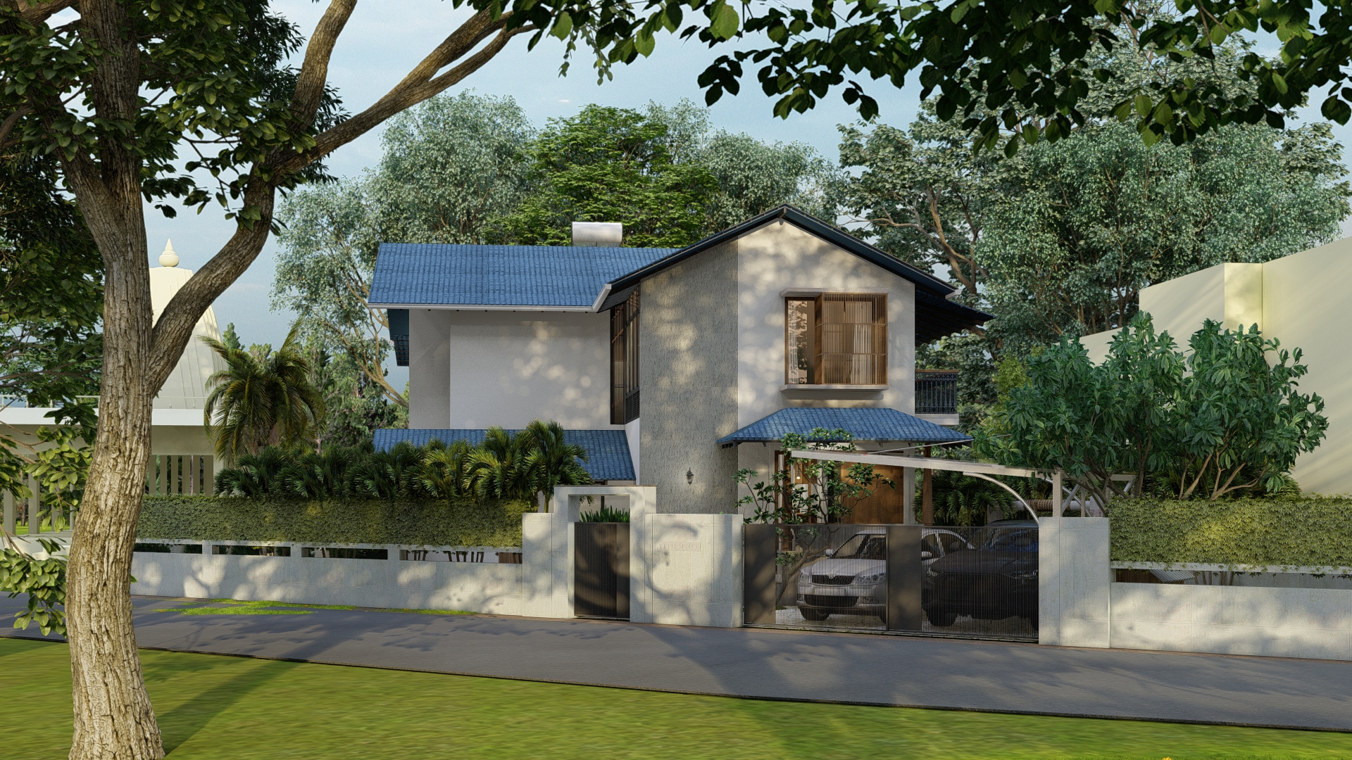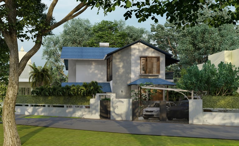 The project "Vrindavan" is one of the most exciting and heartfelt endeavors we've undertaken. It's not just about the design; it's about Sandesh Nayak and Kusum Mallya, our cherished clients. As architects, we encountered numerous challenges on site, especially with the triangular plot and significant area allocated for road widening. We meticulously designed the house within the net area, adhering to by-laws and Vastu principles. Embracing the site context, we chose Mangalore tiled roofing in a blue shade, reflecting the clients' love for the color. Every space is thoughtfully crafted to align with their hobbies and activities, ensuring their retirement life is enriched with joy and comfort in their perfect home, "Vrindavan."